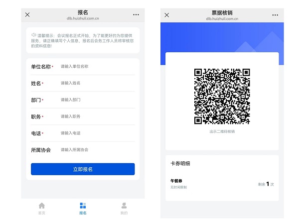 會議報名成功即可自動出餐票,出示二維碼領票,進行核銷。