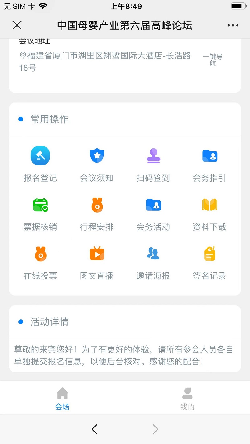 會議使用的功能有:報名登記、會議須知、掃碼簽到、會務指引、票據核銷、行程安排,會務活動,資料下載,在線投票,圖文直播,邀請海報,簽名記錄。