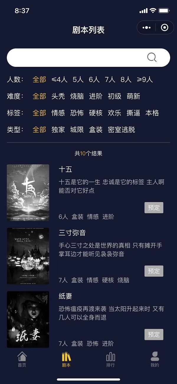 劇本列表可以查看所有的劇本情況,包括劇本需要人數(shù),難度,標(biāo)簽,類(lèi)型等。
